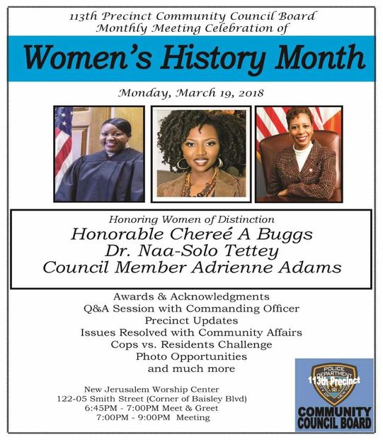 While modern society has started recognizing the individual contributions of women, the Community Council of the NYPD’s 113th Precinct on Monday honored three Southeast Queens individuals who have risen to the ranks of local leadership. Councilwoman Adrienne Adams (D-Jamaica), Queens Supreme Court Justice Hon. Cheree A. Buggs, and Dr. Naa-Solo Tettey of NewYork-Presbyterian Hospital were the honorees at the group’s monthly meeting in commemoration of March as Women’s History Month.