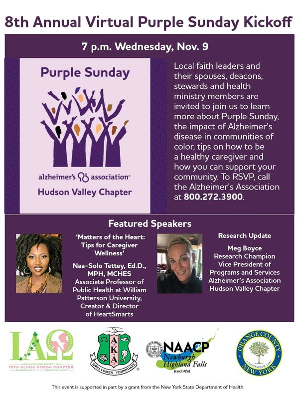 The Alzheimer’s Association Hudson Valley Chapter will hold a Virtual Purple Sunday Kickoff event at 7 p.m. Wednesday, Nov. 9, via Zoom. This kickoff is designed to introduce people unfamiliar to Purple Sunday to the program and increase general awareness of Alzheimer’s and other dementia in the African American and Hispanic communities through houses of worship. While anyone is welcome to attend this free webinar, organizers would particularly like to invite local faith leaders and their spouses, deacons, stewards and health ministry members.